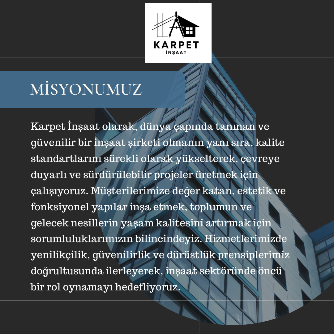Bizler KARPET İNŞAAT olarak, müşteri memnuniyetini en üst düzeyde tutmak ve güvenilir bir iş ortağı olmak için varız. Her adımda, her projede ve her işte, sizlere karşı olan taahhüt ve sorumluluğumuzu en iyi şekilde yerine getirmek için çalışıyoruz.